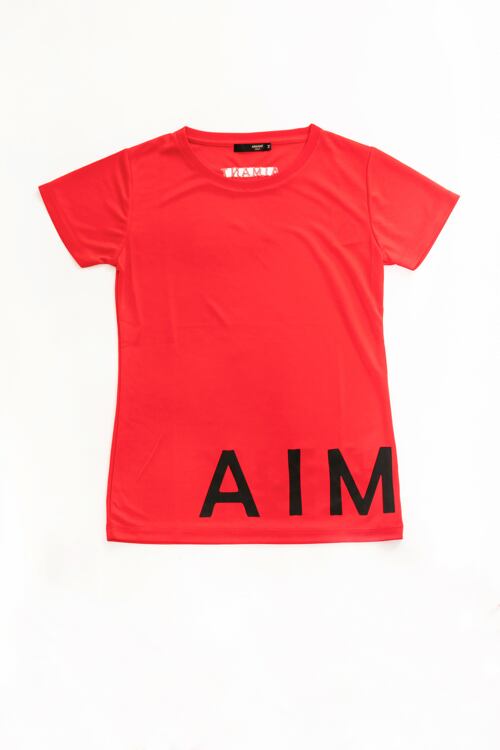 AIMANTのビッグロゴプリントが目を引く、ドライタッチ素材のTシャツ。