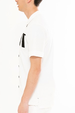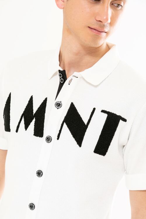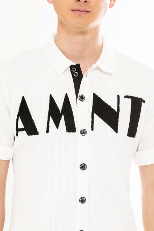 ふっくら立体的なフロントの「AMNT」サガラ刺繍がインパクトのあるワッフル生地ポロシャツ 。